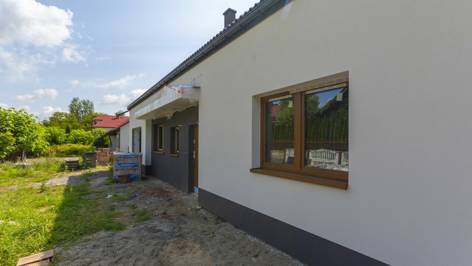 Na zewnątrz wykonana elewacja, osadzone okna i drzwi; trwają prace wykończeniowe. Teren przy odbiorze będzie wyłożony kostką przy budynku i opaską z kamyczków wokół domu.